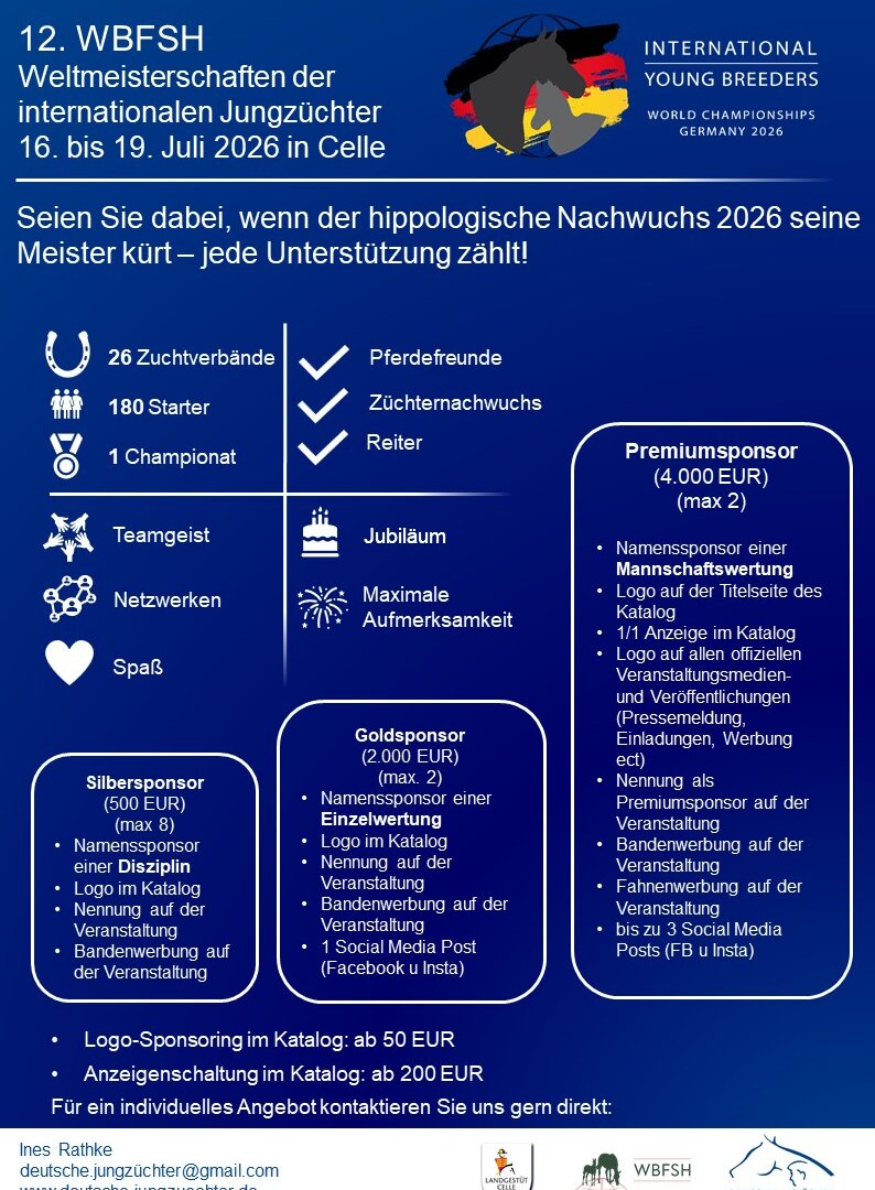 Unterstützen Sie die 12. WBFSH Weltmeisterschaften der internationalen Jungzüchter und nutzen Sie die größte Plattform für Jungzüchter um Ihr Unternehmen vorzustellen!